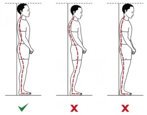 Stand with your back against a wall and slowly roll your spine up so it touches in sequence: lower back, mid-back, shoulders, and finally the back of your head. This helps you sense proper alignment.